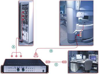 The EndoScout acquires the three gradient command signals (A) and the tracking sensor signals (B) and transmits the calculated location and orientation of the tracking sensor to the computer of the MR scanner (C).